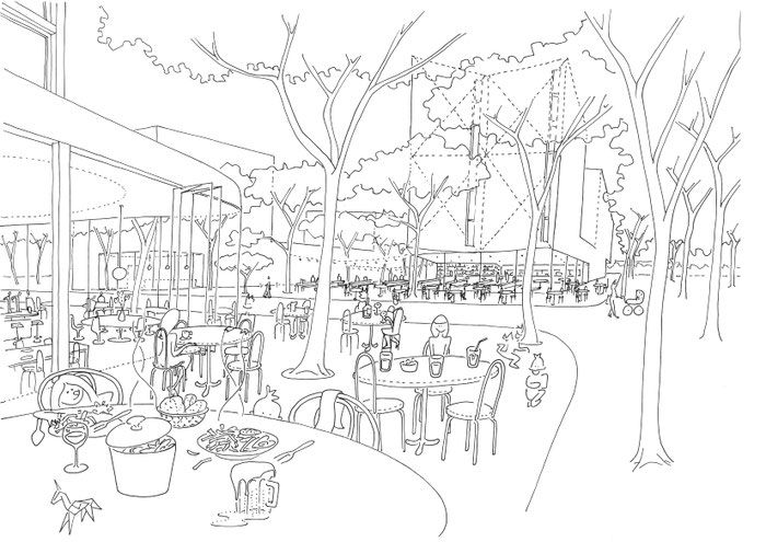 Au nord du Q13, le jardin s’achève sur une guinguette en continuité du restaurant, et face à elle, le biergarten du Q12 lui