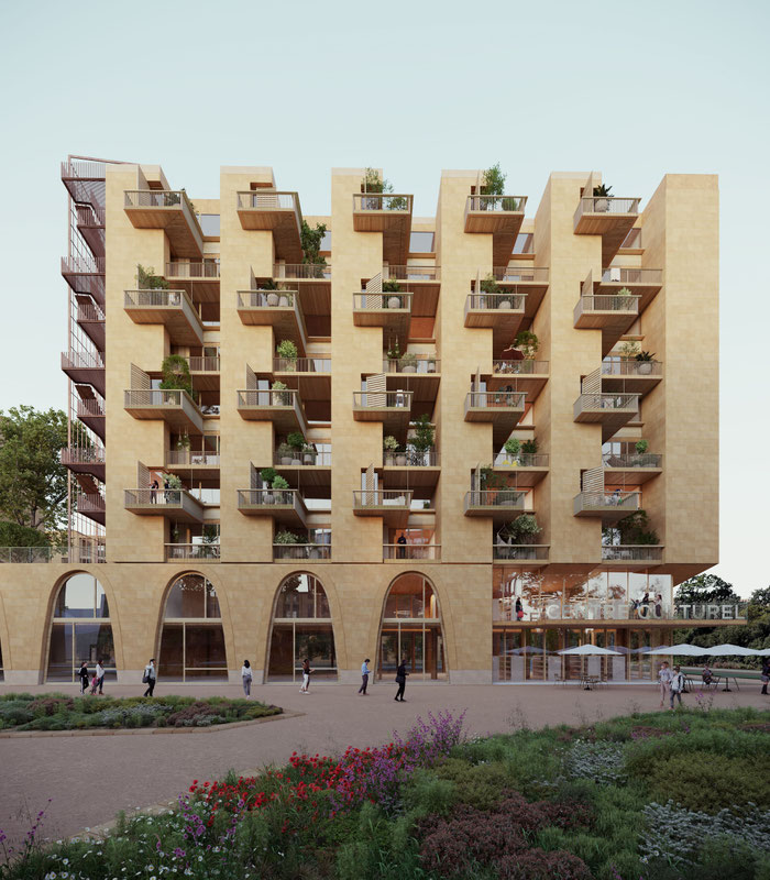 Bénéficiant d’une situation centrale unique, entre l’allée principale et le Cours de Corbeville, les lots Q12 et Q13 portent et développent à l’échelle architecturale et domestique ces grands enjeux urbains.
