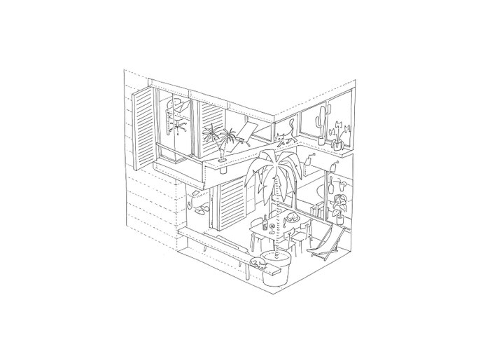 Cet espace fonctionne comme un patio : une ouverture des chambres attenantes permet à ses occupants d’avoir accès directement à l’extérieur, une autre porte ouvre sur l’espace central du logement.